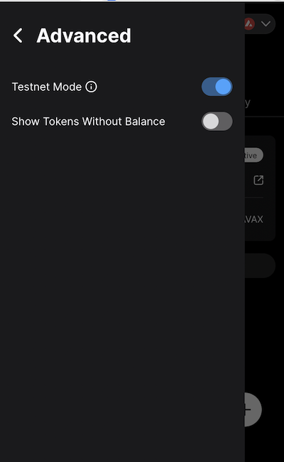 To switch to the Fuji test network, go to Settings, select Advanced, and then toggle Testnet Mode to ON.